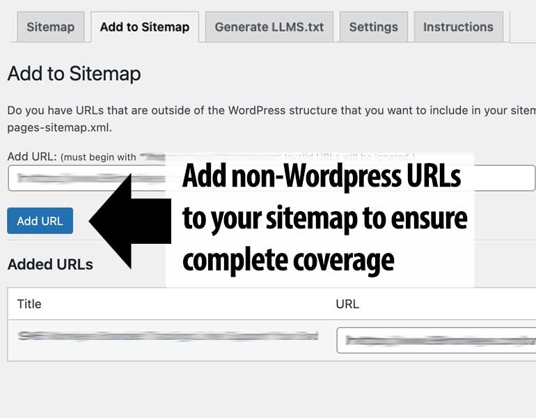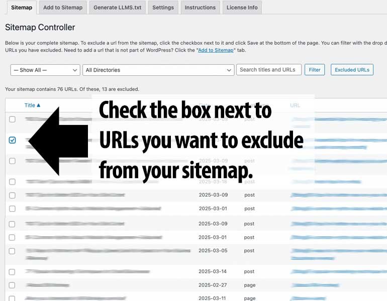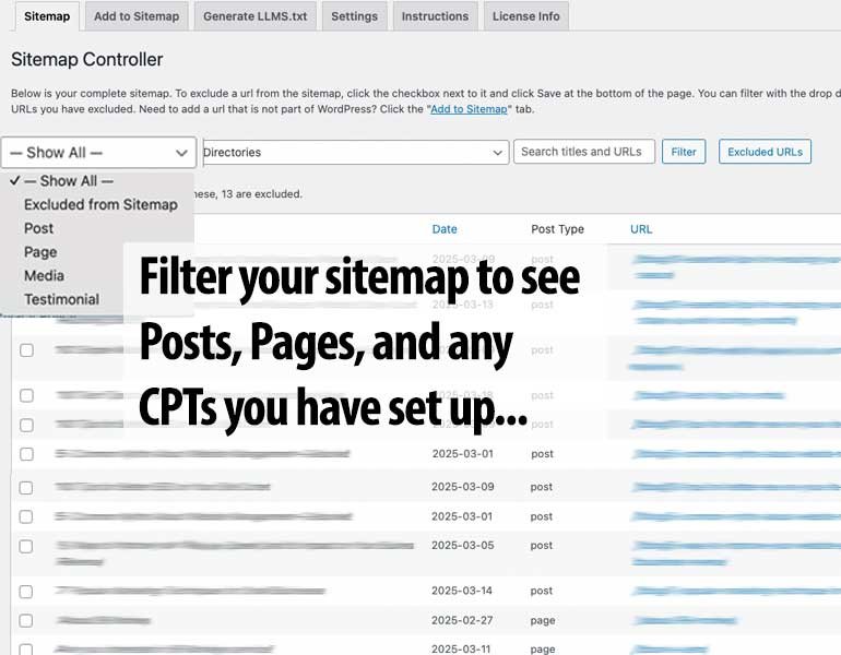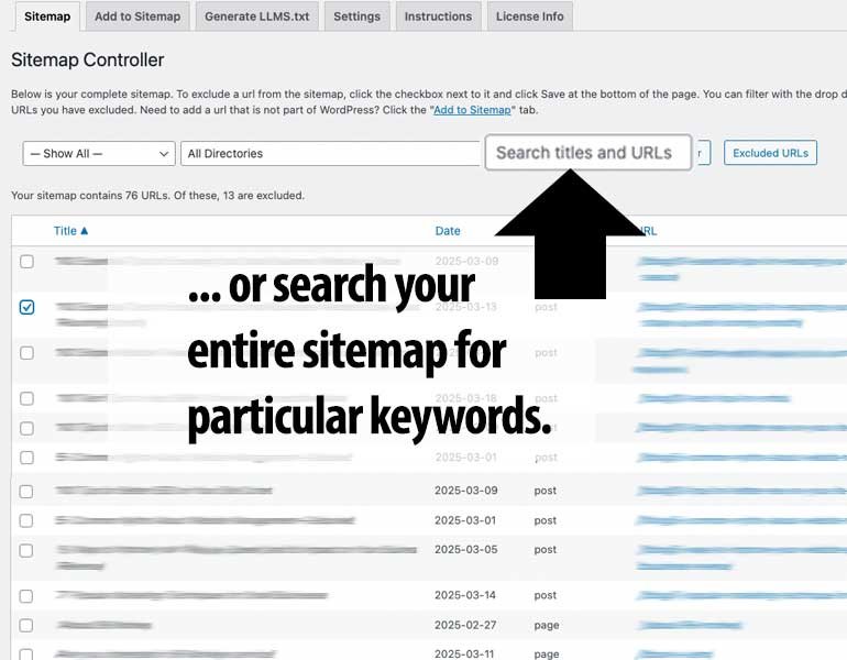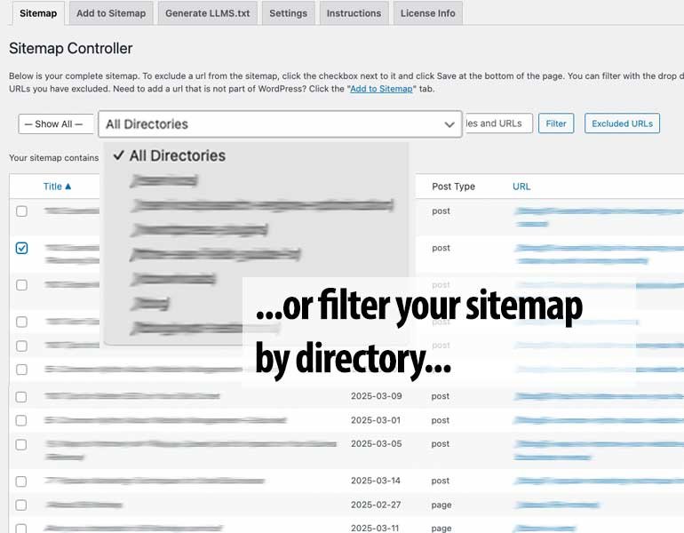 It gives you direct control over your sitemap contents. Exclude specific posts/pages, add custom URLs that aren’t part of WordPress, and analyze your sitemap with filters (by type, by directory) and search.