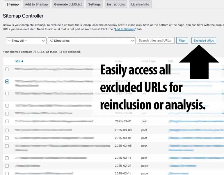 It gives you direct control over your sitemap contents. Exclude specific posts/pages, add custom URLs that aren’t part of WordPress, and analyze your sitemap with filters (by type, by directory) and search.
